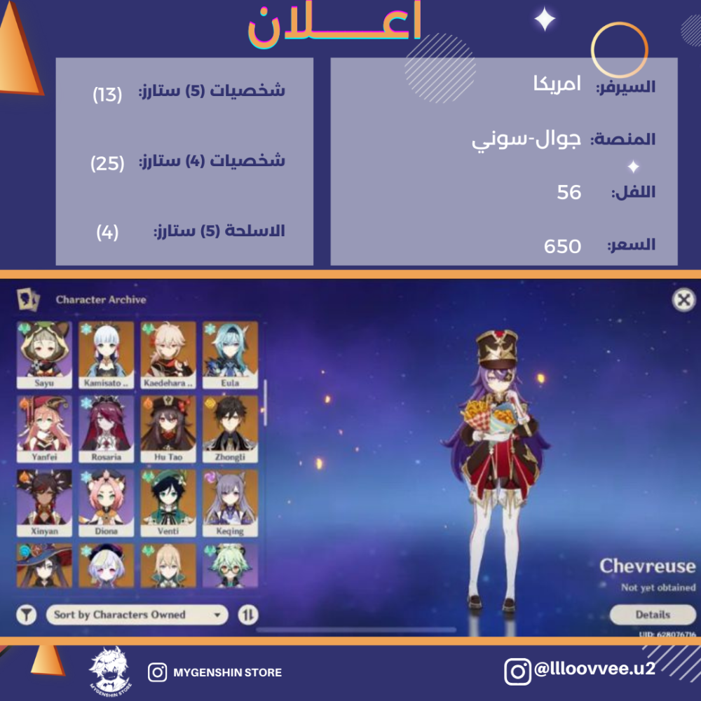 (llloovvee.u2) حساب سيرفر امريكا لفل 56 يحتوي (13 شخصيه)