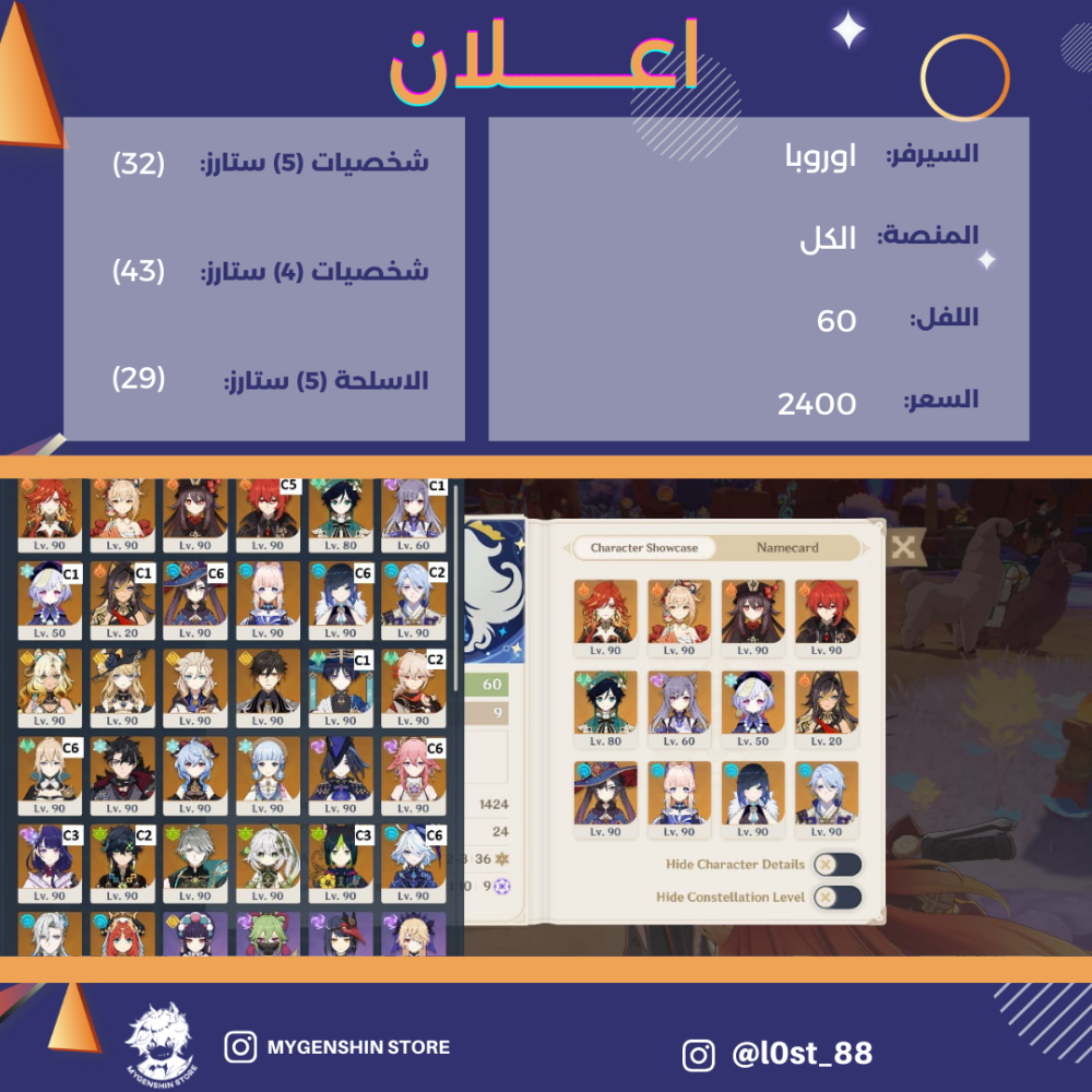 (l0st_88) حساب سيرفر اوروبا لفل 60يحتوي(32 شخصية)