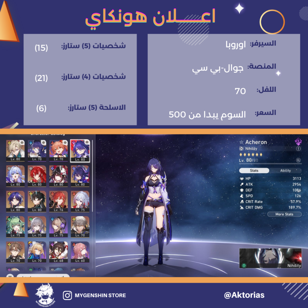 (Aktorias) حساب سيرفر اوروبا لفل 70يحتوي(15 شخصية)